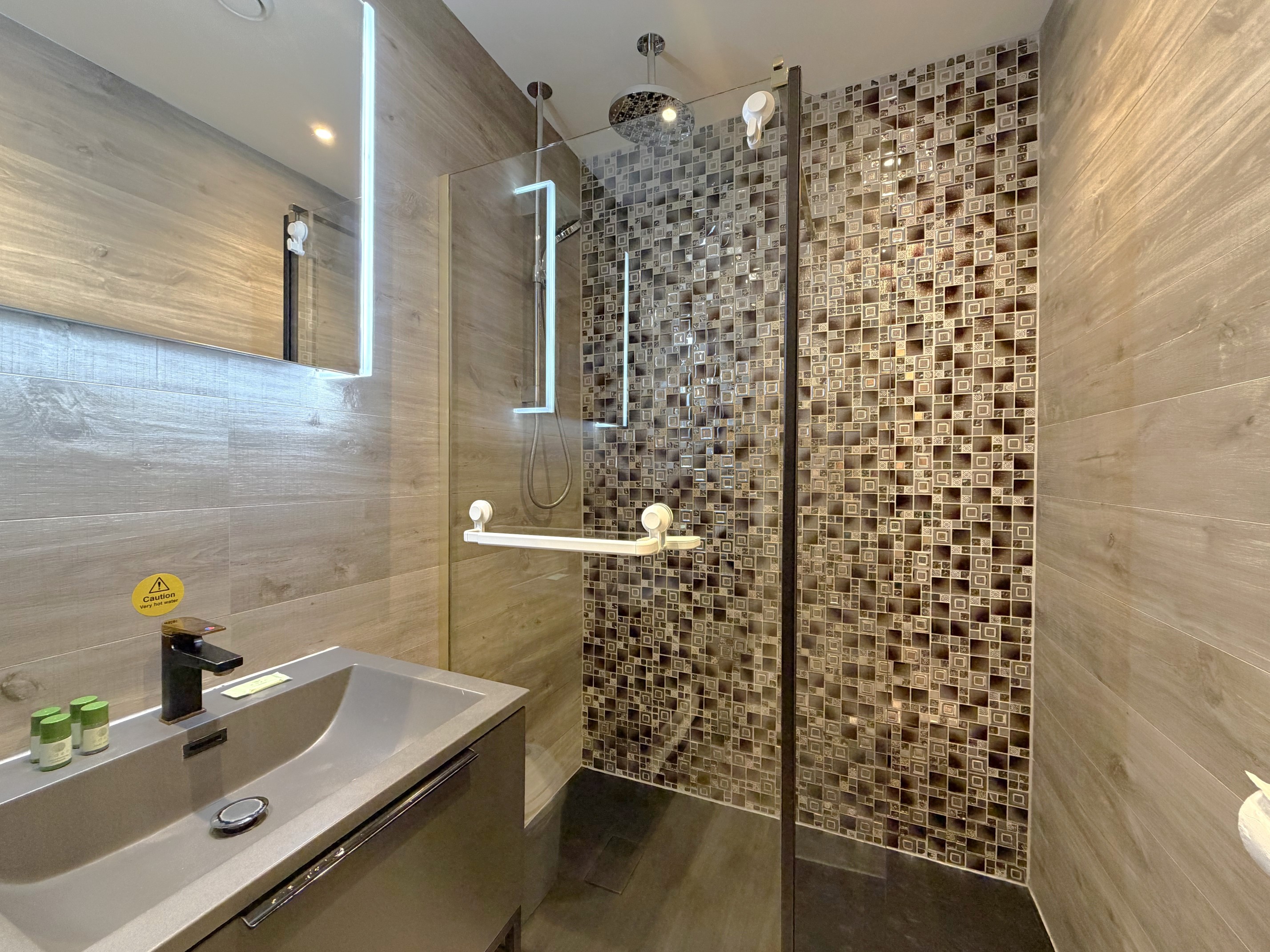 Walk-in shower, toilet, sink